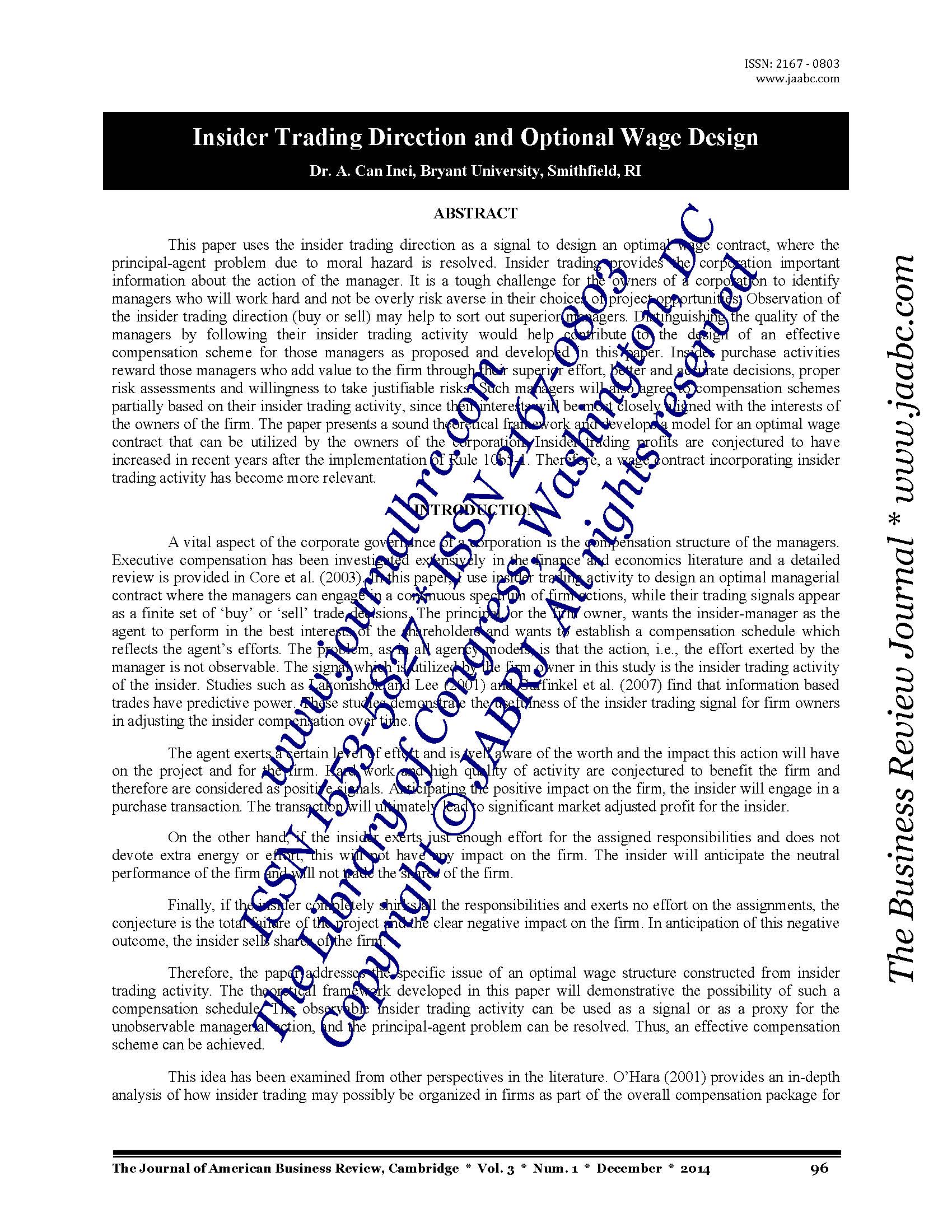 Insider Trading Direction and Optional Wage Design Dr. A. Can Inci, Bryant University, Smithfield, RI |